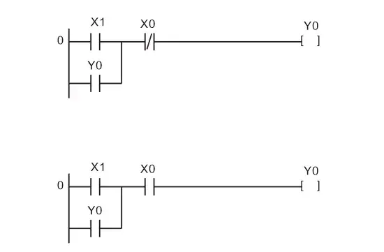 输入端的电气原理图中停止按钮SB0用常闭触点,串在控制线中,用于停机控制。启动按钮SB1用常开触点。在设计的两个梯形图完成的控制功能相同,但停机信号X0使用的触点类型不同,那么连接在端点的外部停机按钮触点类型也就不同