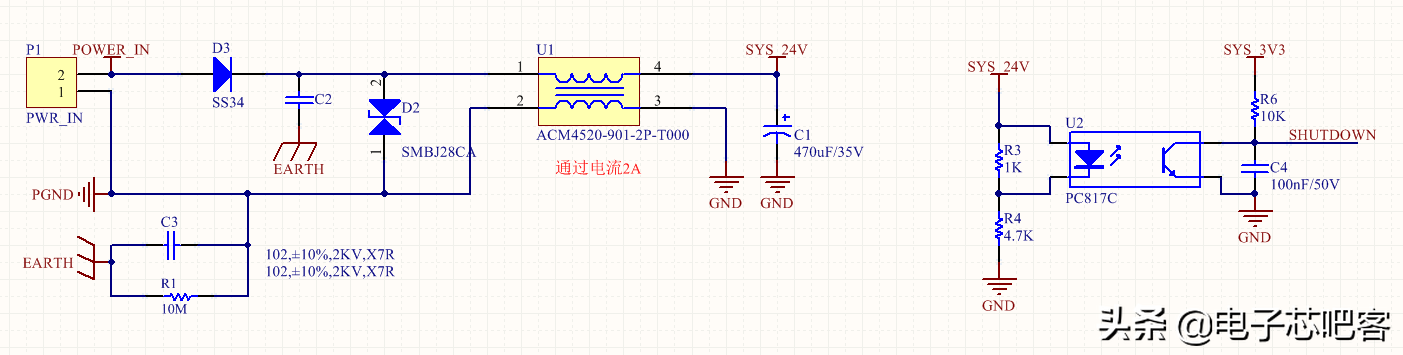 电源我采用的一个二极管进行防反接,主要是这里电源电流也不高,没有必要使用MOS管。EARTH是一个简单的屏蔽地。电源经过一个共模线圈去掉共模干扰。使用一个光耦,进行电源检测。