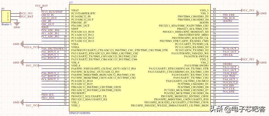 复位电路使用的是外部专用的复位芯片MAX809,和RC复位电路相比,其可靠性更好。在快速开关机时,由于电容上次放电并没有释放完毕,导致单片机启动异常,而使用复位芯片则能够很好的解决这一问题。