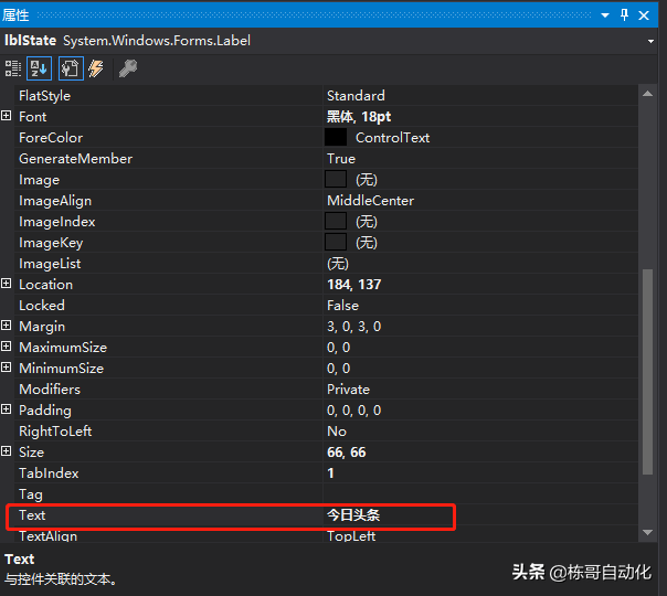 4.从控件工具库中拖拽Label标签 命名为lblState并把text属性改为 今日头条 模拟运行状态