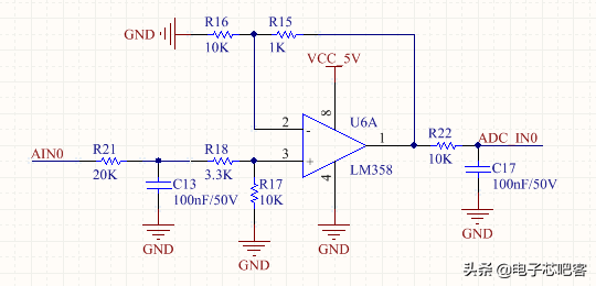 ADC采用的是单片机自带的ADC,电路设计使用的是LM358运放,将外部输入电压按照一定的倍数进行缩放,以便单片机进行采集。在我的这个电路板上有三路这个样的电路。