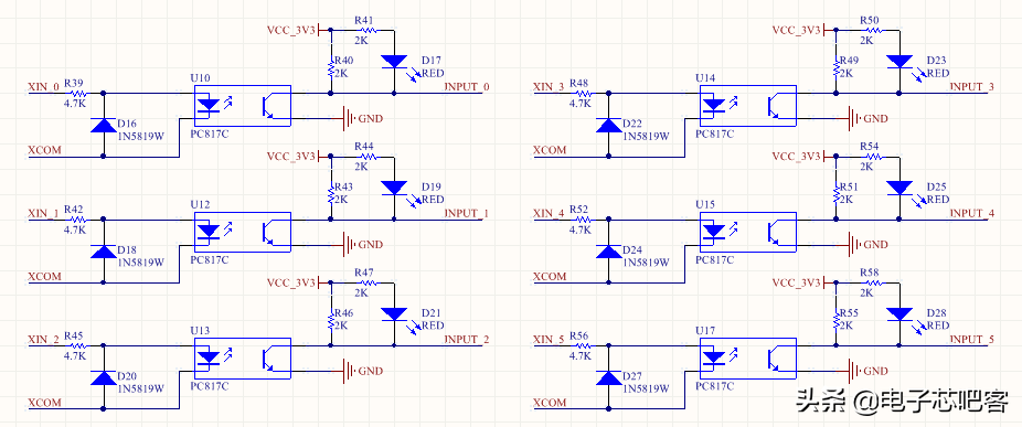 输入电路采用了PC817C进行了光耦隔离。4.7K电阻进行了限流,注意光耦的发光二极管的电流一般采用10mA即可,具体可以看手册。1N5819W的二极管主要是起到保护作用。当输入信号接反了的之后则通过这个二极管进行释放。避免损坏光耦,这个光耦的反向击穿电压只有6V。