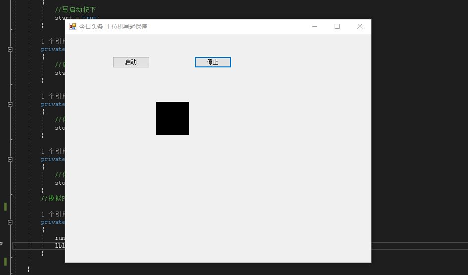 3.从控件工具库中拖拽Button按钮, 分别命名为btnStart和btnStop并把text属性改为启动和停止,并分别创建MouseDown、 MouseUp事件模拟启动按键和停止按键。(双击事件自动创建)