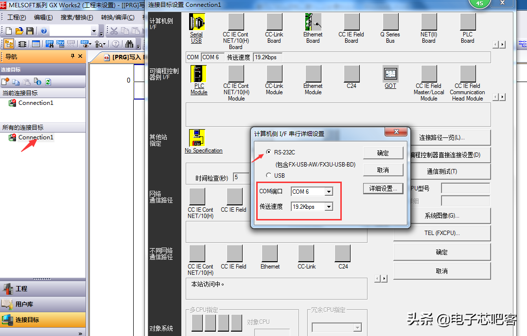 程序验证 将程序下载到单片机之后,如何验证程序的正确性呢?可以使用PLC的编程软件。三菱这款PLC的编程软件支持有两款,GX Developer和GX Works软件,在三菱官网可以下载。这里我使用的是GX Works2。启动软件,选择和合适的型号,建立对应的串口连接: