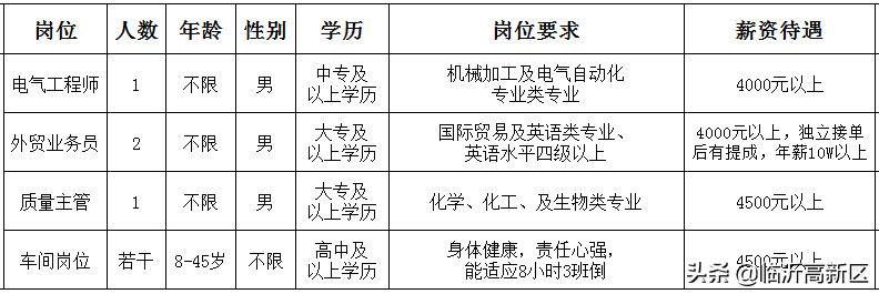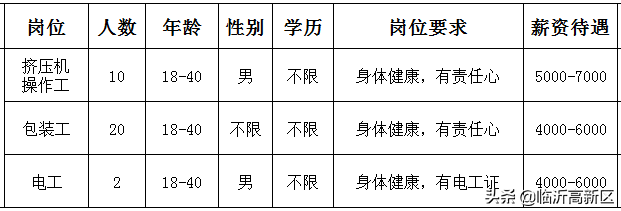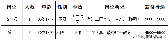 人力资源部:人事专员1名;要求:大专及以上学历,年龄30周岁以下,熟悉人力资源相关模块,可接受相关专业应届毕业生;安全环保部:环保专员2名;要求:大专及以上学历,年龄35周岁以下,能完成环保相关规章制度的建档,熟悉环保监测及数据存档上报等工作的优先,可接受相关专业应届毕业生;综合办公室:保安2名;要求:45周岁以下,身体健康,无纹身烟疤,无犯罪记录,(兼消防司机需持有B2及以上驾驶证,能熟练驾驶车辆,额外补助);员工餐厅帮厨1名;要求:年龄45周岁以下,熟练摘菜洗菜切菜,熟悉配菜,能协助大厨完成炒菜,厨房卫生清理及协助售饭工作。员工餐厅保洁1名;要求:年龄45周岁以下,负责餐厅公用餐具清洗消毒,餐厅桌面地面等卫生清理及餐厅售饭工作。招待服务员1名;要求:年龄35周岁以下,身体健康,形象气质佳,负责公司招待就餐服务及相关区域所有用品的清理清洁工作,有服务行业工作经历的优先辅助/生产部门岗位