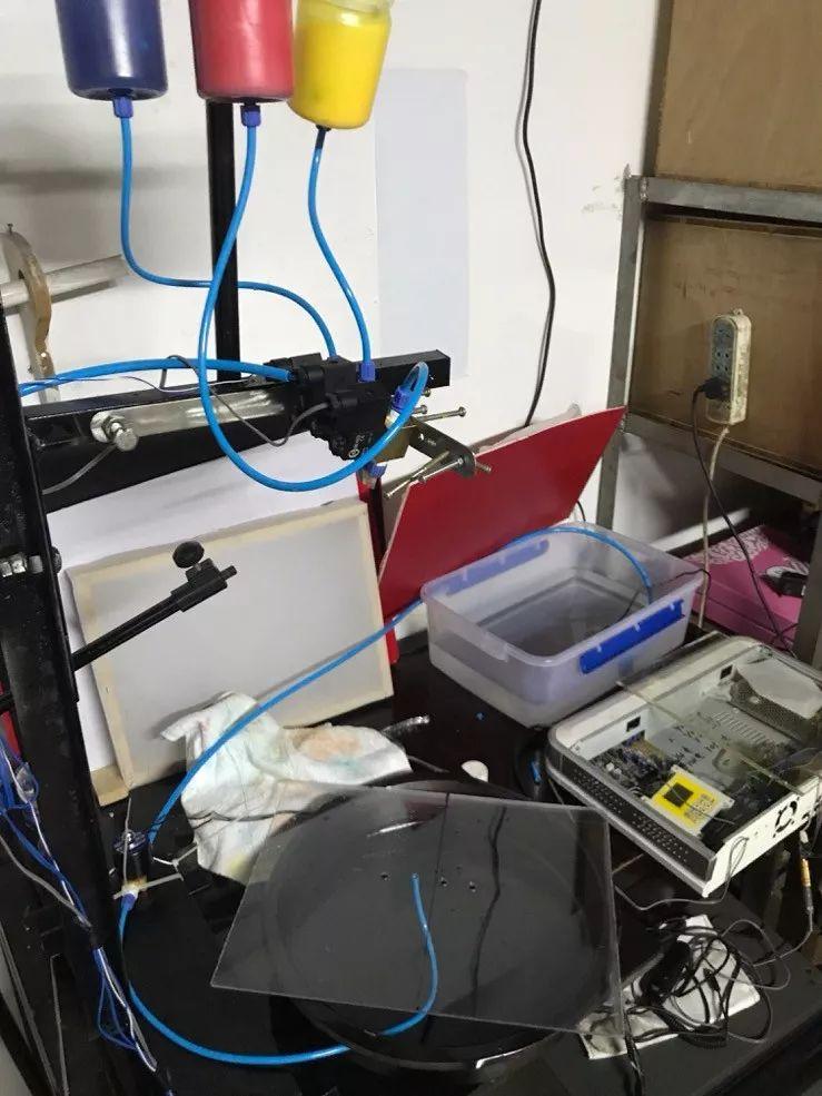 自己焊接可调节高低的龙门架,然后用黑色自动喷漆喷上油漆,待干后,装上电磁阀。垃圾房找来三个饮料瓶底部开孔8mm,用热容器把塑钢快接头固定在瓶底,与电磁阀对接连上胶管。