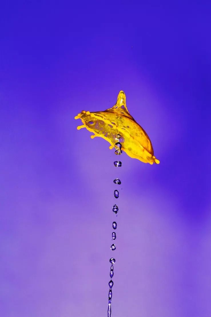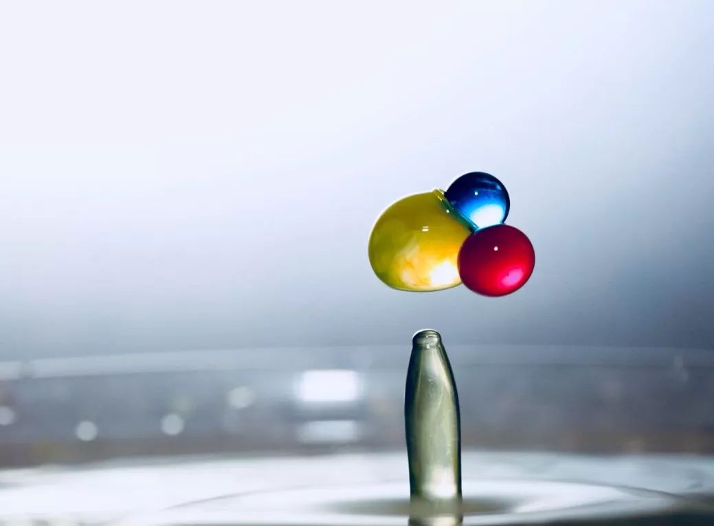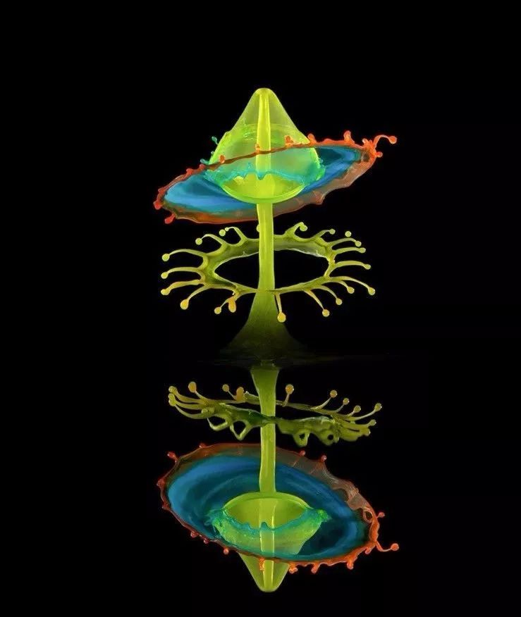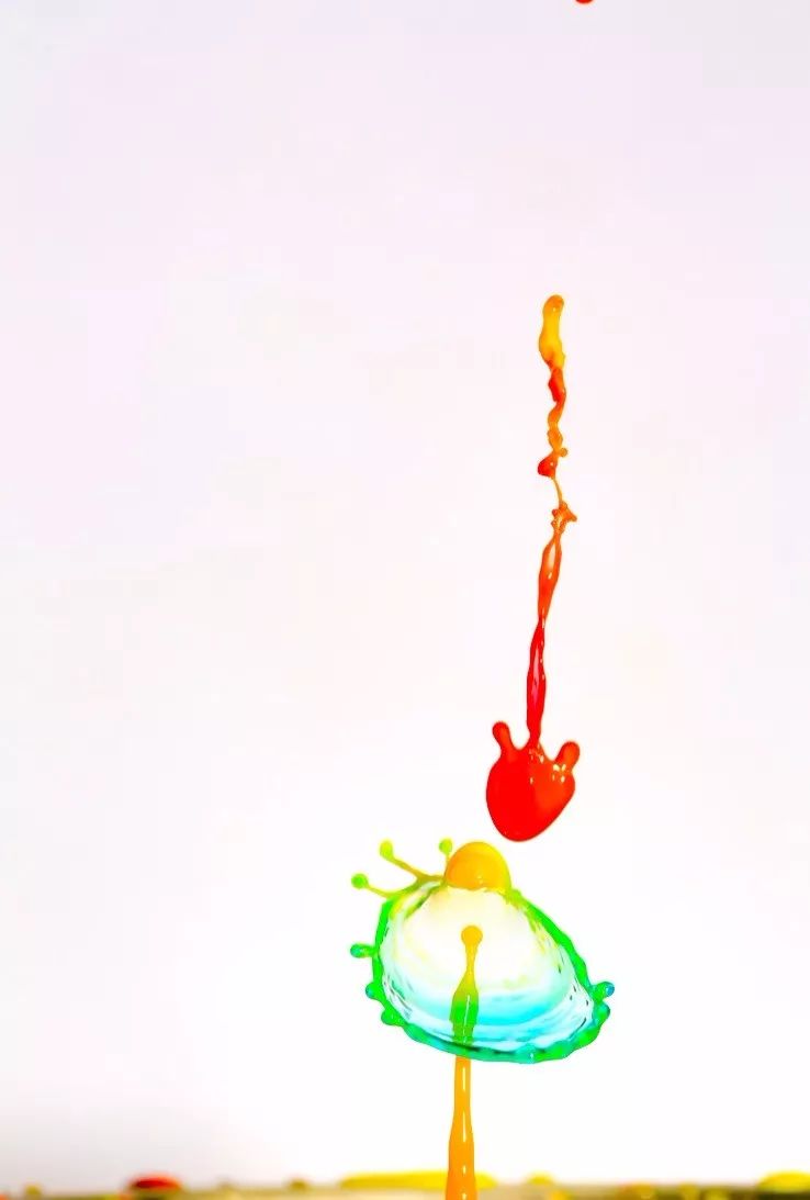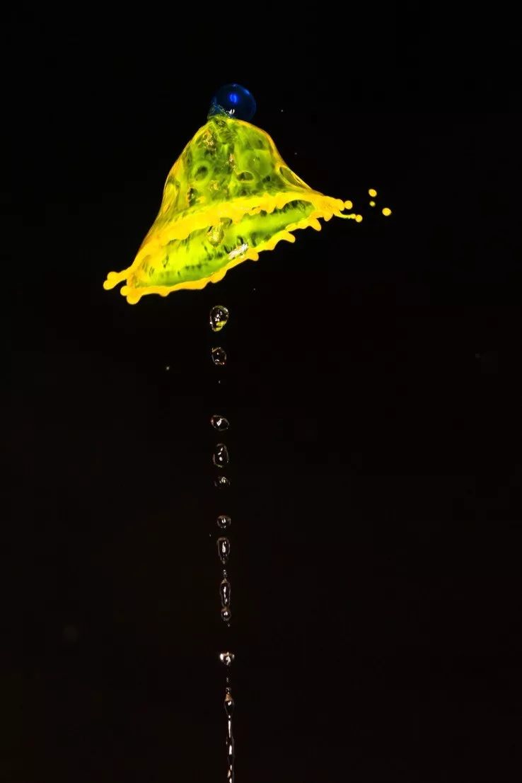 第一滴黄色水滴弹起后与第二次同一种颜色的水滴碰撞形成的水冠,第二第三电磁阀发出的红色和蓝色水滴还未到达形成的画面: