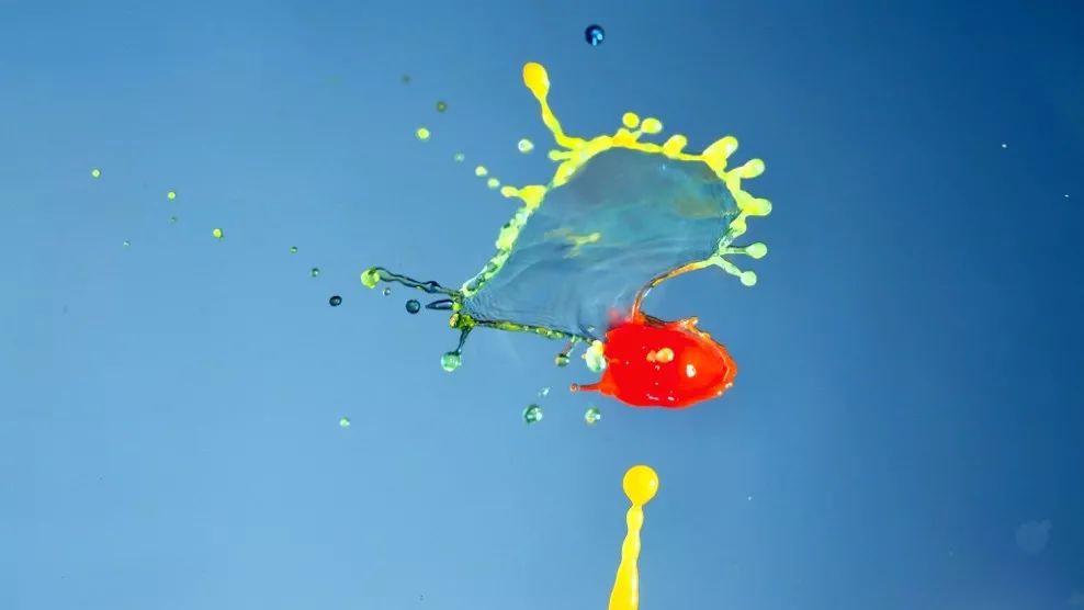 黄色和红色水滴碰撞后形成的伞形,蓝色水滴未进行碰撞: