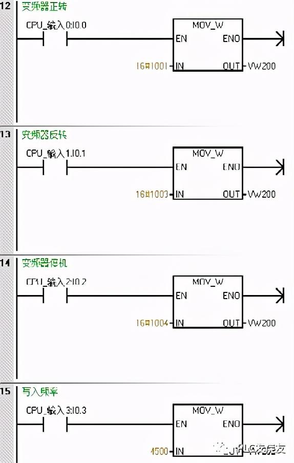 第七步:(使用触点控制变频器启动、停止、正转、反转、写频率)