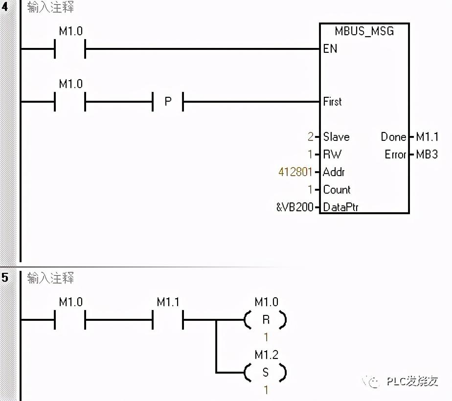 程序段5使用轮询的方式来做,当M1.0接通,完成位M1.1接通复位M1.0并置位下一条MSG指令M1.2。