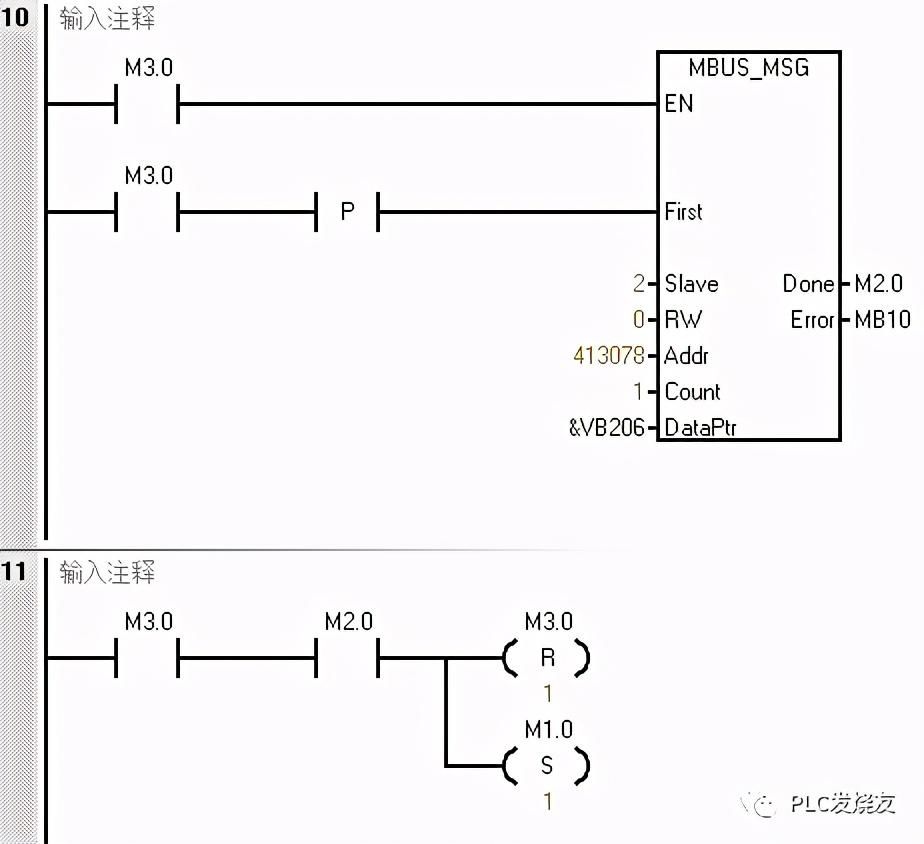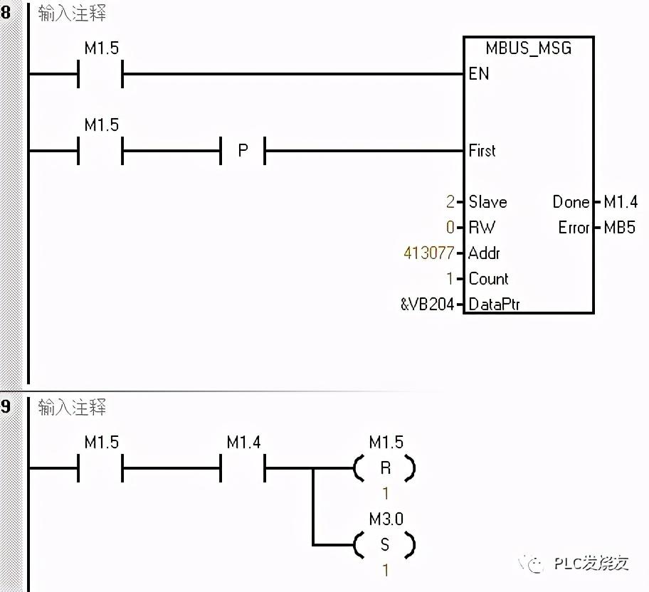 程序段7使用轮询的方式来做,当M3.0接通,完成位M2.0接通复位M3.0并置位下一条MSG指令M1.0。