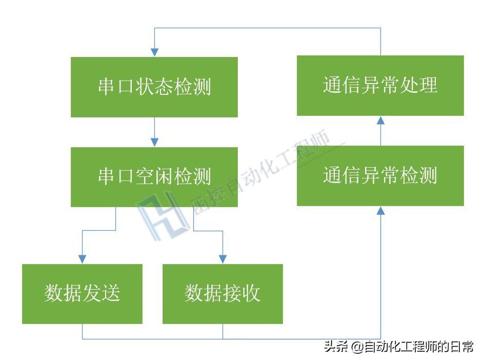 串口自定义协议实现过程。在处理串口通信的过程中,在进行数据传输的过程中一般都会有几个动作,如串口状态查询、串口空闲查询、数据发送、数据接收、异常检测、异常处理。