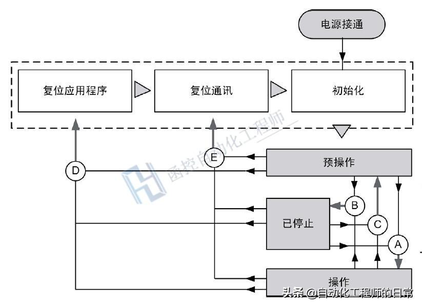 在PLC程序的编写过程中,可以使用状态机的控制思路,将一些复杂的控制过程使用状态机的方法处理。这里简单给大家介绍一下什么是状态机?如下图所示,为一个状态机的状态图。