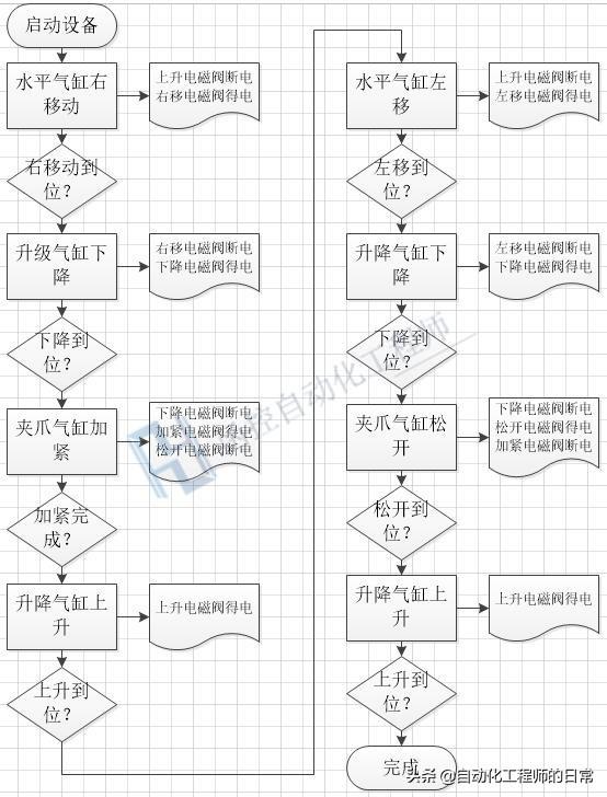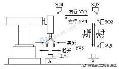 这里以机械手物料取放机构为例给大家分享。这个是我以前给大家分享的一篇文章PLC编程示例-机械手物料取放。在这篇文章中,我以类似于“流水线”的方式给大家分享如何处理这类流程控制逻辑。