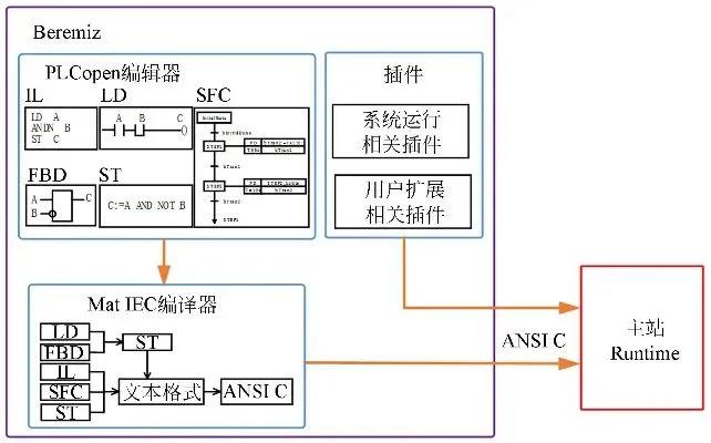 集成开发环境(IDE),Beremiz.py。它运行在用户的计算机上,使用 C 代码作为中间语言,用于编写、编译、调试 PLC 程序和控制 PLC 运行时。