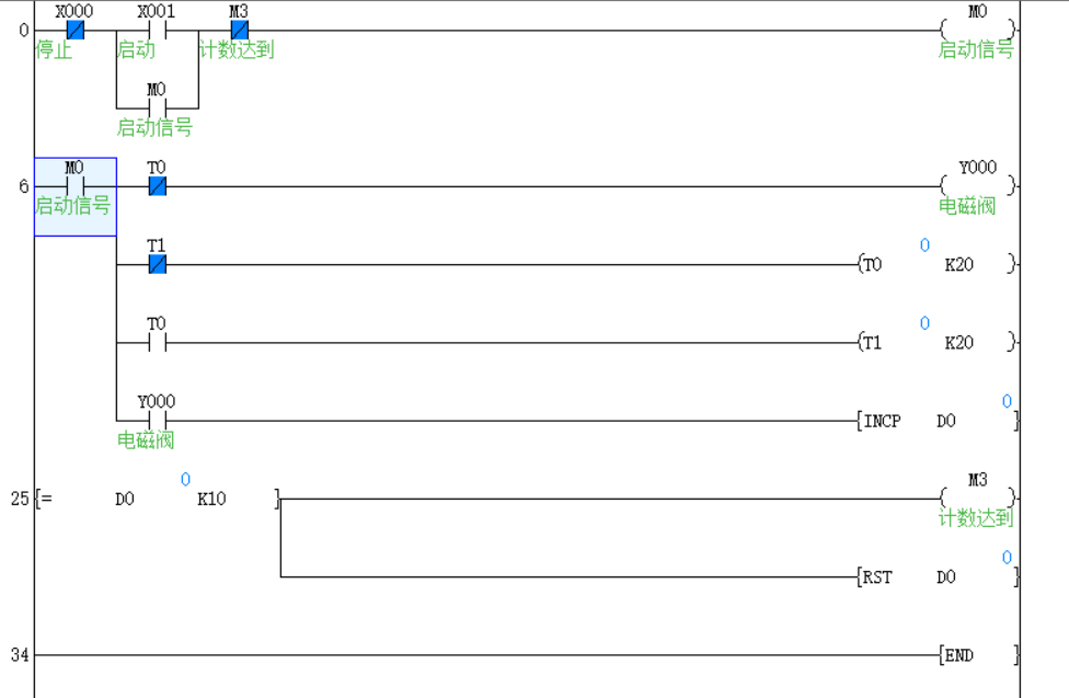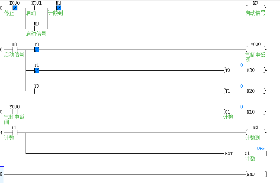 当按下启动按钮X1,让气缸来回伸缩动作,气缸的动作通过电磁阀Y0来控制(Y0得电气缸伸出,断电气缸缩回),动作要求是气缸伸出2s,缩回2s。动作来回10次,动作完成。如果继续执行需要再次按下启动按钮。外部要求有停止X0按钮。