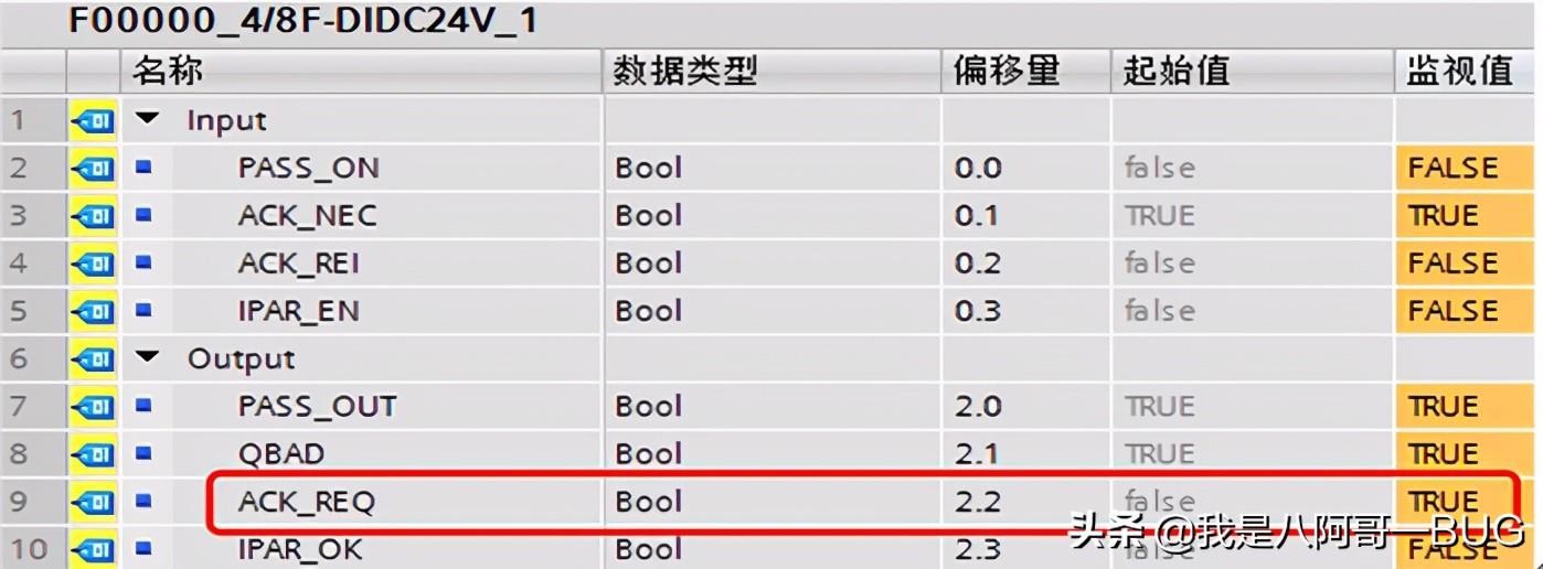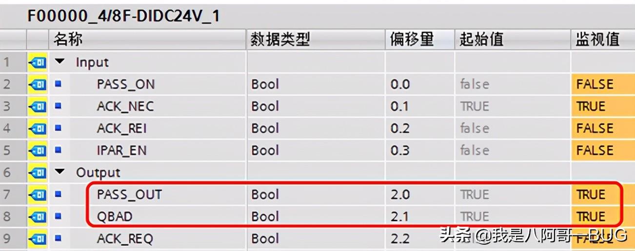 在编译硬件组态时,安全系统会为每个F-IO模块自动创建一个F-IO DB。可以在程序中评估其中的变量PASS_OUT和QBAD, 如果F-I/O 发生钝化,则变量 PASS_OUT = 1 和 QBAD = 1 。下图是TIA Portal软件中ET200S 4/8 F-DI模块发生故障进入钝化状态时的F-IO DB变量ASS_OUT和QBAD状态。