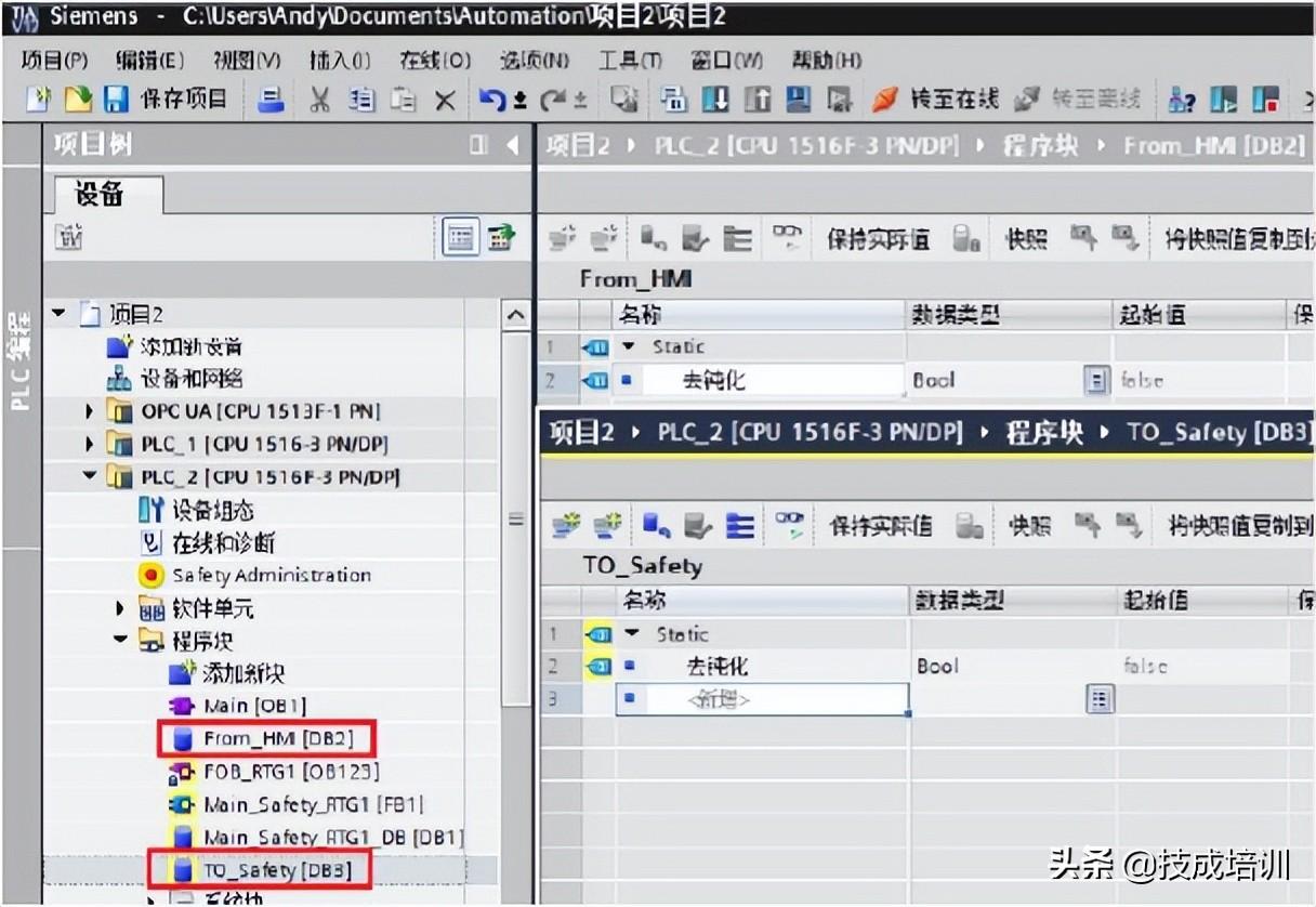 (1)在TIA Portal中 创建一个新项目,组态 S7-1500F 站点,并添加一个标准DB2(From_HMI)和一个安全DB3(TO_Safety),如下图所示。