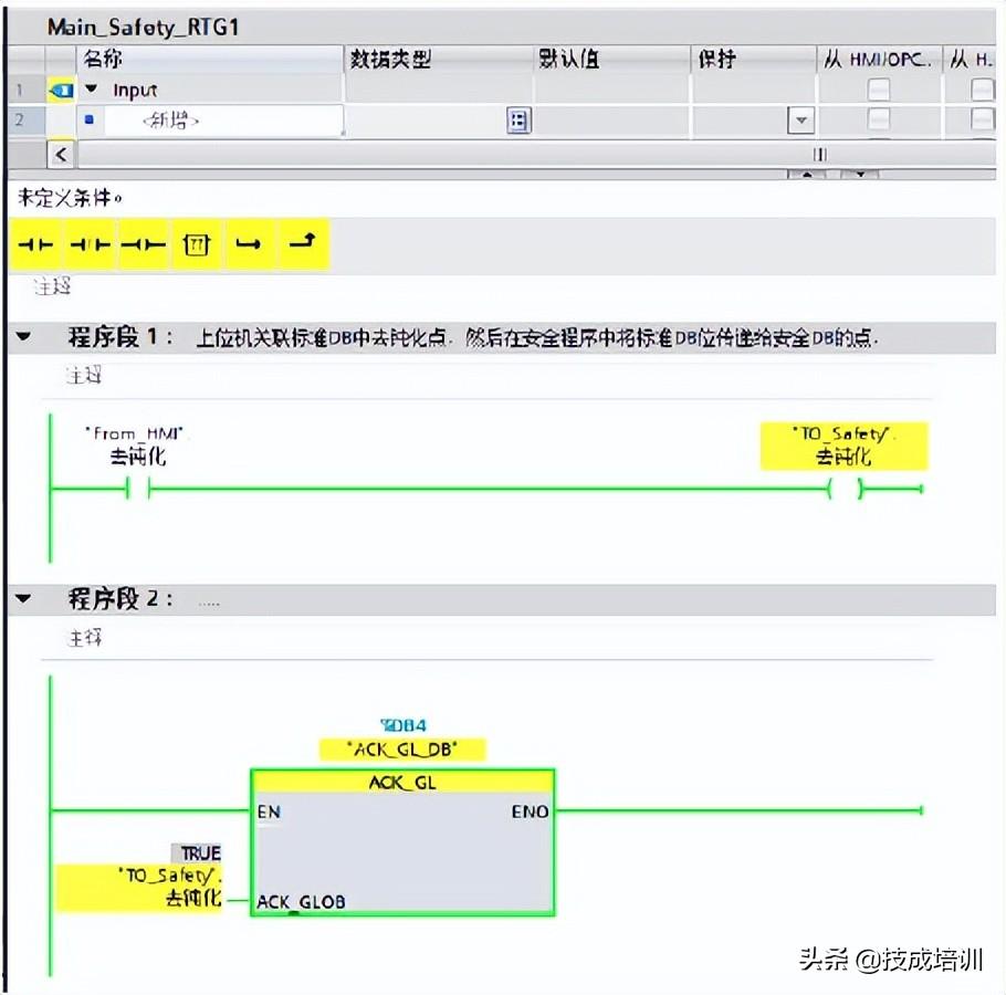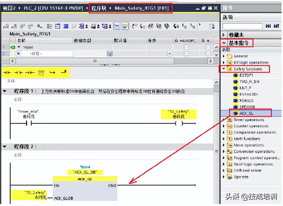 (2)在安全的主程序块 FB1(Main_Safety_RTG1)中,首先将来自HMI的去钝化按钮点传给安全DB中的点,然后从右侧指令->基本指令->Safety function下调用ACK_GL全局去钝化指令,指令中的ACK_GLOB关联HMI传递过来的安全DB点,该管脚上升沿触发,如下图所示。