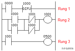 在上面的例子中,每次操作员按下0000按钮,DIFU1000指令就会变为“真(Ture)”并持续一个扫描周期。注意,DIFU1000是在输入0000的上升沿时处于ON状态(变为True)。换句话说,只是在输入0000打开(变为“真”)的初始阶段,DIFU1000指令变为“真”(True)。