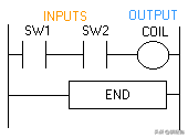 注意,在这个简单的单级梯形图中,我们用梯形图重新创建了上面的外部电路。这里我们使用了LOAD指令和OUT指令。一些制造商要求每一个梯形图最后一个梯级上包括一个END指令,一些PLC还需要在END指令之后的梯级上执行ENDH指令。