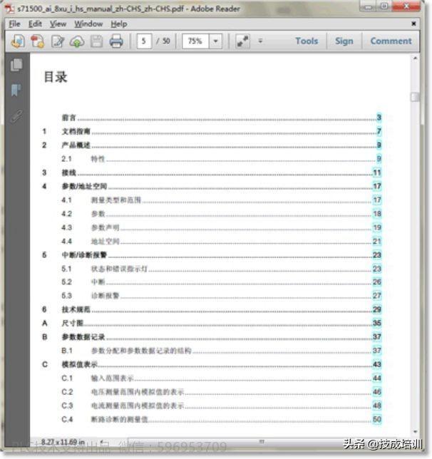 第二部分目录,从目录中我们可看到,整个文档的内容结构,其中包括:接线、参数/地址空间、诊断、技术规范、尺寸图等。
