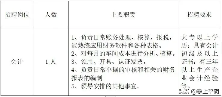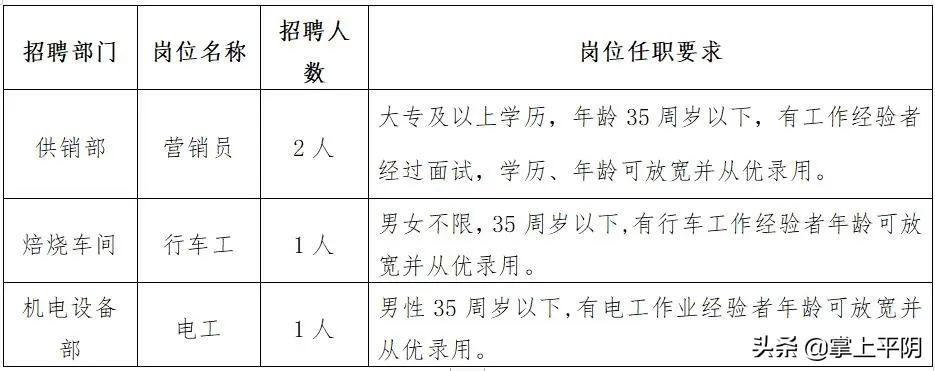 1、模具维修工5名招聘条件:年龄40岁以下,机械、机电相关专业,有设备、模具操作或管理经验者优先,工资4000-10000元。2、拌料工5名招聘条件: 年龄50岁以下, 身体健康,能吃苦耐劳. 工作时间:三班倒,上12小时歇24小时。白班工作时间:早7点到晚7点,夜班工作时间:晚7点到早7点。3、车间女工10名招聘条件:年龄50岁以下,身体健康,能吃苦耐劳,有工作经验者优先。工作时间:三班倒,上12小时歇24小时。白班工作时间:早7点到晚7点,夜班工作时间:晚7点到早7点。4、生产管理人员5名招聘条件:年龄45岁以下,大专以上学历,有生产管理经验,熟悉生产计划、调度,具有一定的组织协调能力。有相关工作经验者优先,工资4000-6000元。