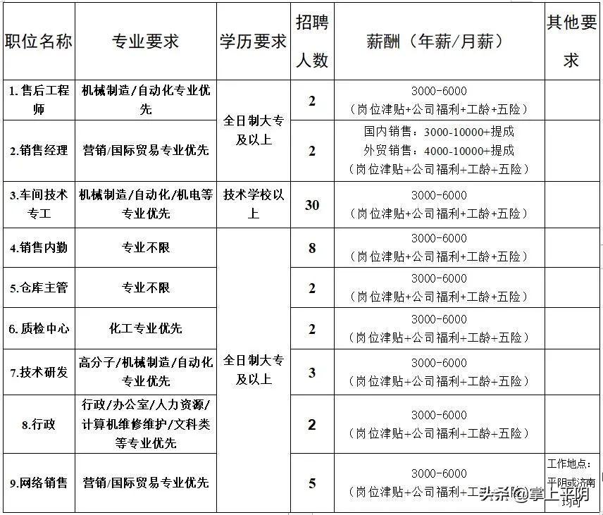3、公司提供免费午餐,市场部门提供班车(平阴-孝直)。晋升空间大,不拖欠工资。正常上岗一个月后购买五险。