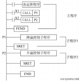 X1为上限位温度传感器、X2为下限位温度传感器,对于这种情况下我们可以利用子程序的功能,X1为ON时,调用降温控制子程序,X2为ON时,调用升温控制子程序。这是将子程序分成各个小块,需要时调用执行,使得程序结构比较清晰明了。
