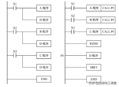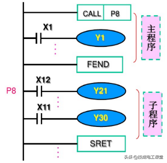 1、子程序在FEND指令的后面,以标号P开头,以返回指令RET/SRET结束。