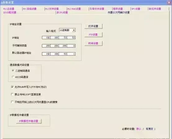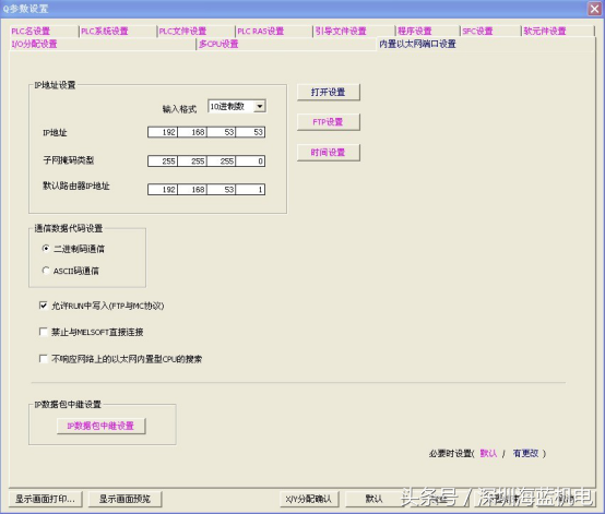 今天来用三菱PLCQ13UDEH和组态王6.55 开始通信操作,用Melsec_Ethernet.dll(60.3.14.30)驱动。用这个驱动的时候应当注意,选择“允许RUN中写入(FTP与MC协议)” 。不然就能发生变量只可以读取却不可以写入的弊端