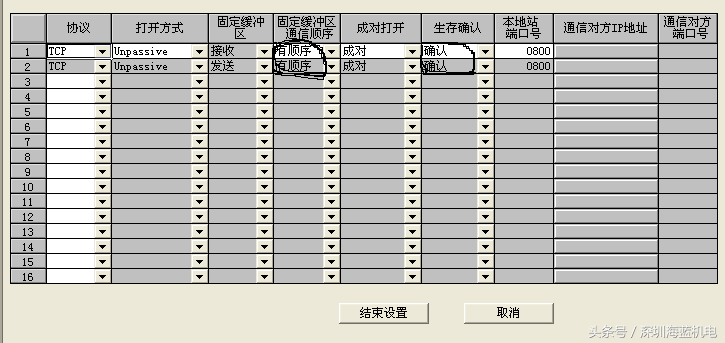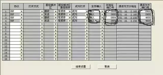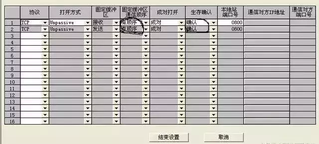 上图是选取TCP通讯协议时的状况,图中圈定的两个地方一定要注意,第一个地方一定要选择“有顺序”,不然会导致通讯失败,第二个地方要选 “确认”,这么做才能与上图中的设置相匹配,不然会出现很长时间的通讯恢复。