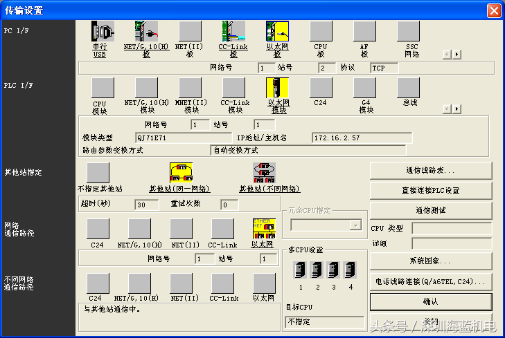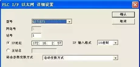 可以依照实际情况选取上图中的“网络类型”,“起始I/O号”,“网络号”,“组号”,“站号”,并且选取相应“模式”。
