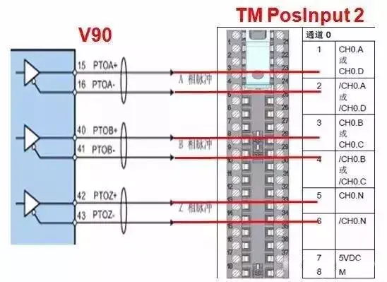 分别连接 V90 X8 端口的 15、16 端子到 TMPosInput 模块 1、2 端子;40、41到 3、4 端子;42、43 到 5、6 端子。