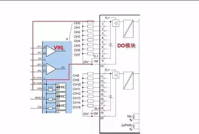 在本例中针对 DO 模块的第 0 通道,(微信:503660666),DO 模块的 1 端子与 V90 X8 接口的 5 端子相连、DO 模块的 10 端子与 V90 X8 接口的 3 端子相连。DO 模块的 9 端子和 10 端子分别要连接 24V+和 0V。其中 DO 模块的 10 端子与 V90 X8 接口的 3 端子连接还起到两个系统的等电位连接的作用。