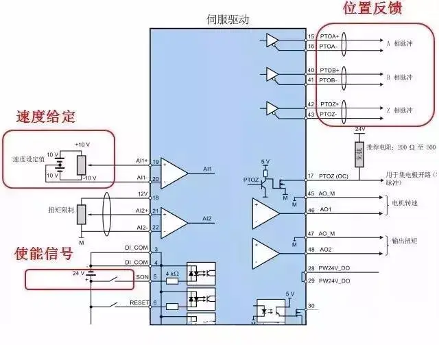 PLC与伺服电机之间通过伺服放大器进行链接PLC与伺服放大器之间使用以下三种方式:1、位置控制,即使用脉冲序列进行控制,PLC侧需要高速脉冲输出或者位控模块2...