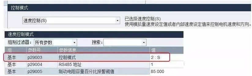本中使用 SINAMICS V-ASSISTANT 软件来设置 V90 的参数。首先要设置 V90 操作模式为速度模式,即设置参数 p29003 为 2。