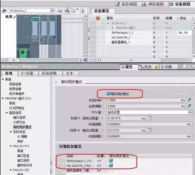 在“IO_device_1”的设备视图中选择“属性”、“常规”、“等时同步模式”页面,然后勾选站点以及站点上模块的“等时同步模式”,如下图所示: