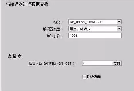 编码器类型选择增量式旋转式。单转步数填写 V90 每转输出脉冲个数的 4 倍(信号评估选择了四重),这里填写 4096(4*1024)。增量实际值中的位填写0。