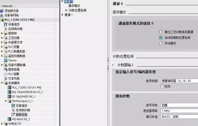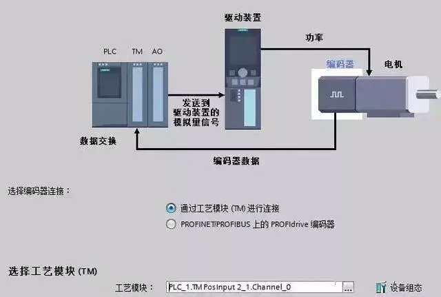 组态编码器连接时选择通过工艺模块(TM)进行连接,并且在选择工艺模块中选择高速计数器通道 0。