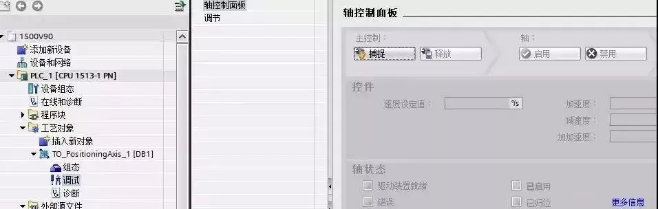 至此 S7-1500 与 V90 的组态配置与接线都已经初步完成,可以打开工艺对象的调试界面进行调试,然后就可以编写控制程序了。具体内容可参考帮助文档,这里不再详述。