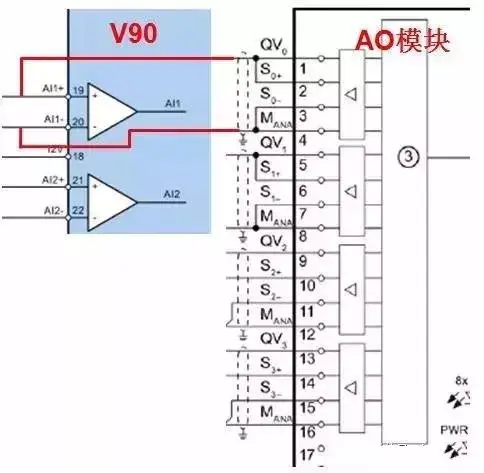 AO 模块输出+-10V 电压信号,针对于第 0 通道 1、2 端子短接后连接 V90 X8 端口的 19 端子,3、4 端子短接后连接 V90 X8 端口的 20 端子。