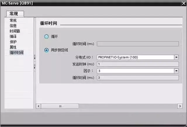 OB91 是 S7-1500 运动控制的核心组织块,为了更好的实现运动控制功能,需要把OB91 的循环时间同步到总线。具体操作过程是鼠标在 OB91 上点击右键,在弹出的菜单中选择属性,就会弹出以下页面。在页面中选择“同步到总线”。可根据应用情况选择“因子”,增加“因子”可减轻 CPU 负荷,但会影响控制效果。