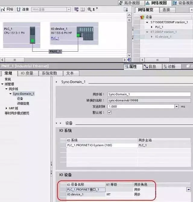 在网络视图中用鼠标双击连接线“PN/IE_1”在下边的“属性”、“常规”页面内选择“同步域”、“Sync-Domain_1”,设置“PLC_1.PROFINET 接口_1”的“同步角色”为“同步主站”,设置“IO_device-1”的“RT 等级”为“IRT”。