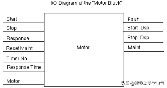 在工业混料过程的示例中使用两个进料泵和一个搅拌机。每个电机都由其自身的"电机块"控制,该块对于所有三个设备都相同。该块要求 6 个输入:两个输入用于启动或停止电机,一个输入用于复位维护显示器,一个输入用于电机响应信号(电机运行/不运行),一个输入用于时间,在该时间内必须接收响应信号,一个输入用于测量时间的计时器数目。