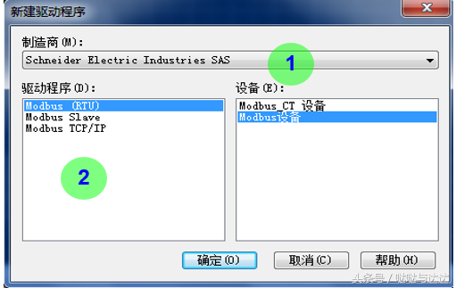 选择 Schneider Electric Drivers (1),选择Modbus TCPIP (2),单击确定