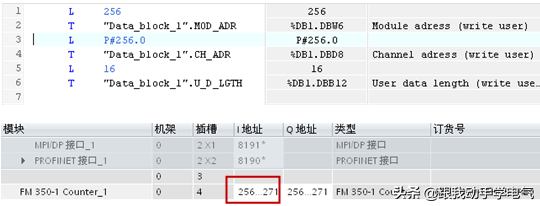 上述地址的赋值根据设备组态中实际已分配的输入地址(即FM350-1模块I区的首地址)进行编程。DB1是CPU与高速计数器模块的通信数据区,在数据块中包含FM350-1的地址信息。例如,逻辑地址256存放在DB1.DBW6中,FM350-1的通道地址与逻辑地址相同,但是表达形式为指针形式,例如P#256.0,FM350-1的接口区长度为16,这些参数的设定为固定模式。除此之外,DB1中还包括当前计数值、比较值及比较器状态等参数,对FM350-1的操作是通过读写数据块DB1实现的。