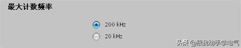在“最大计数频率”选项中选择输入信号的滤波时间,如果输入频率低于20KHz,则应选择“20KHz”选项;若高于20KHz,低于200KHz,则应选择“200KHz”选项,增加信号的滤波时间,如图1-9所示。