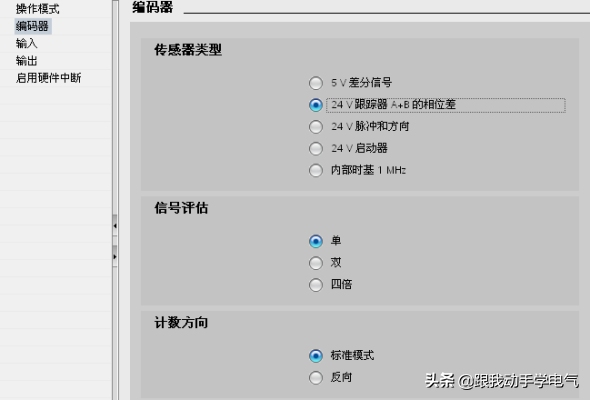 根据编码器类型选择“24V跟踪器A+B相位差”、单倍频计数;在“编码器输入”中选择连接的信号源类型。如果编码器类型为PNP型,则选择“P交换机”,若编码器类型为NPN型,则选择“M交换机”。