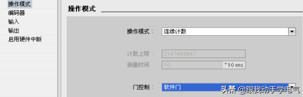 编码器参数设定完成后,单击“操作模式”,选择FM350-1的计数模式,本例中以操作模式为连续计数,门控制为软件门控制为例(如需了解更多FM350-1不同计数模式的区别,请参考西门子下载中心、文档编号为A0479的相关内容),如图1-10所示。